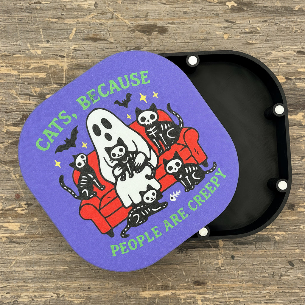 Introvert energy? Haunted and proud? This purr-fect little box says what we’re all thinking: cats are superior, and people… well, they’re best admired from a distance. Featuring a cozy ghost and her bony feline brood, this box is ideal for stashing trinkets, treats, or hexes (no judgment).